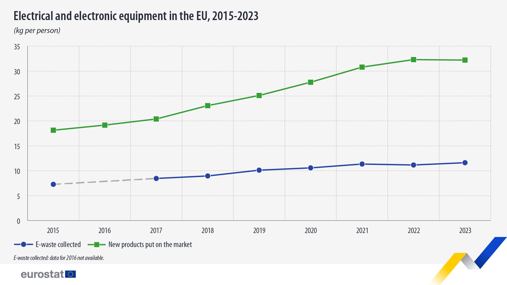 Im Jahr 2023 wurden in der EU pro Einwohner offiziell 11,6 kg Elektro- und Elektronikaltgeräte (WEEE oder E-Abfälle), beispielsweise Haushaltsgeräte, Smartphones und Computer, gesammelt, während pro Person 32,2 kg neue Elektro- und Elektronikgeräte (EEE) auf den Markt gebracht wurden.