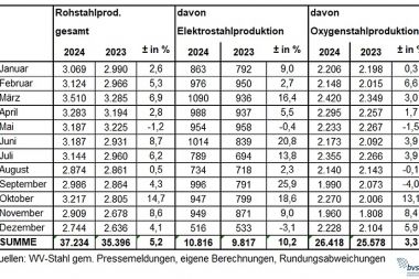 Die deutsche Rohstahlproduktion 2024 beendete das dritte Jahr in Folge unter der avisierten Marke von 40 Mio. Tonnen, teilte der deutsche Stahlverband WV Stahl mit.