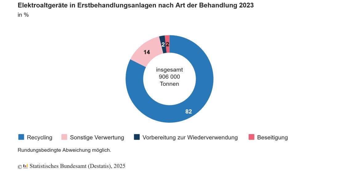 Das waren gut vier Fünftel (82,4 %) der insgesamt 906 100 Tonnen solcher Geräte, die von sogenannten Erstbehandlungsanlagen angenommen wurden, wie das Statistische Bundesamt (Destatis) anlässlich des Internationalen Tags des Elektroschrotts (E-Waste Day) am 14. Oktober 2025 mitteilt.