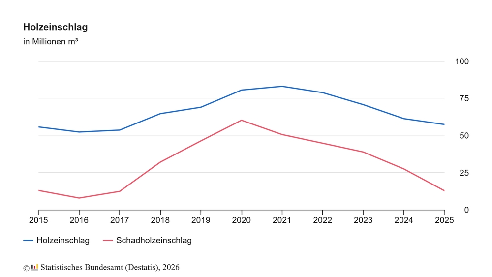 Im Jahr 2025 wurden in den deutschen Wäldern insgesamt 57,3 Millionen Kubikmeter Holz eingeschlagen. Damit lag der Holzeinschlag 6,4 % unter dem Vorjahreswert von 61,2 Millionen Kubikmetern. Wie das Statistische Bundesamt (Destatis) weiter mitteilt, war der Rückgang vor allem auf den stark gesunkenen Schadholzeinschlag (Holzeinschlag aufgrund von Waldschäden) zurückzuführen.