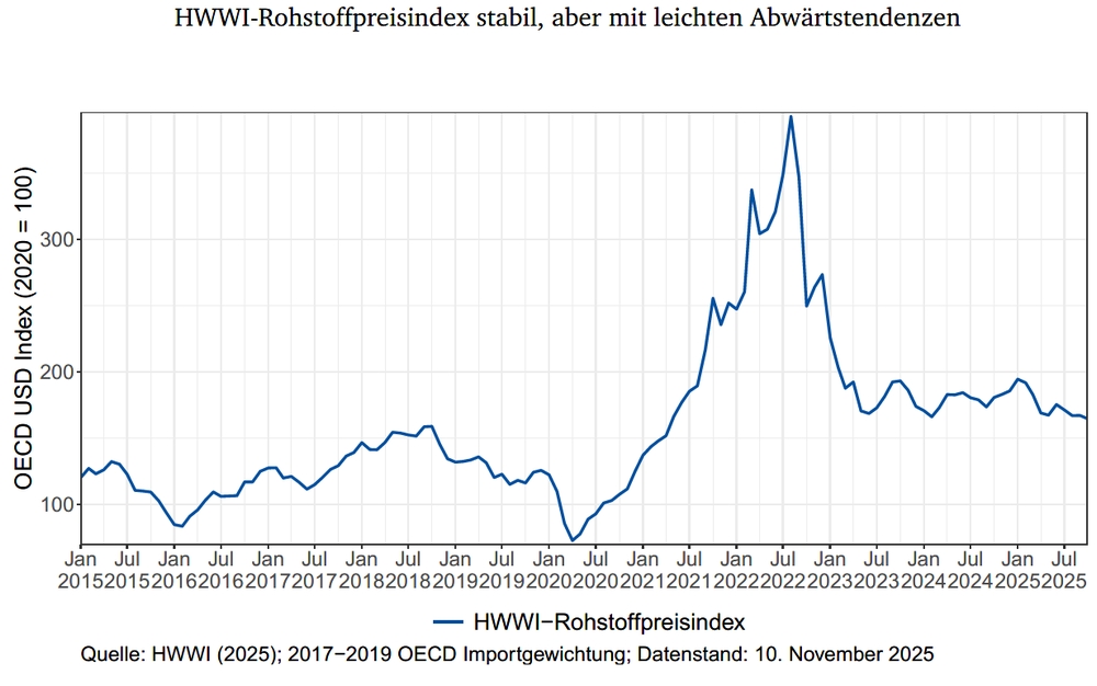 In den vergangenen drei Monaten stand der HWWI-Rohstoffpreisindex unter leichtem Abwärtsdruck (August: -2,5%, September: 0,0%, Oktober: -1,5%). Im Oktober lag der Index damit rund 8,9% unter dem Niveau des entsprechenden Vorjahresmonats (Datenstand: 10.11.2025).