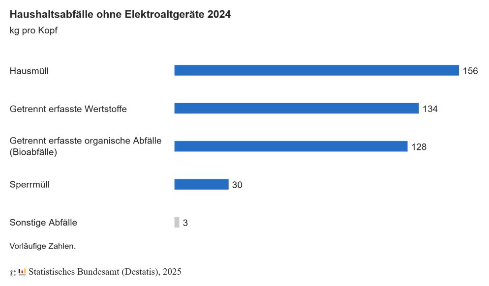 Im Jahr 2024 ist das Aufkommen an Haushaltsabfällen in Deutschland nach vorläufigen Ergebnissen des Statistischen Bundesamtes (Destatis) im Vergleich zu 2023 um rund 1,0 Million Tonnen oder 2,8 % auf 37,7 Millionen Tonnen gestiegen.