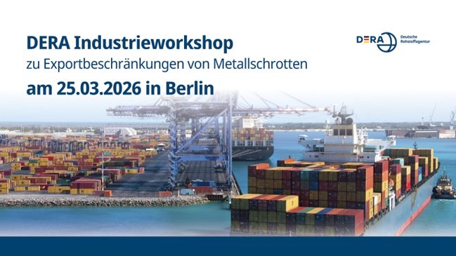 Am 25. März 2026 10:30 - 17:15 Uhr veranstaltet die Deutsche Rohstoffagentur (DERA) in der BGR einen Industrieworkshop zum Thema Exportbeschränkungen von Metallschrotten. Die Teilnahme ist kostenfrei, Anmeldung erforderlich.