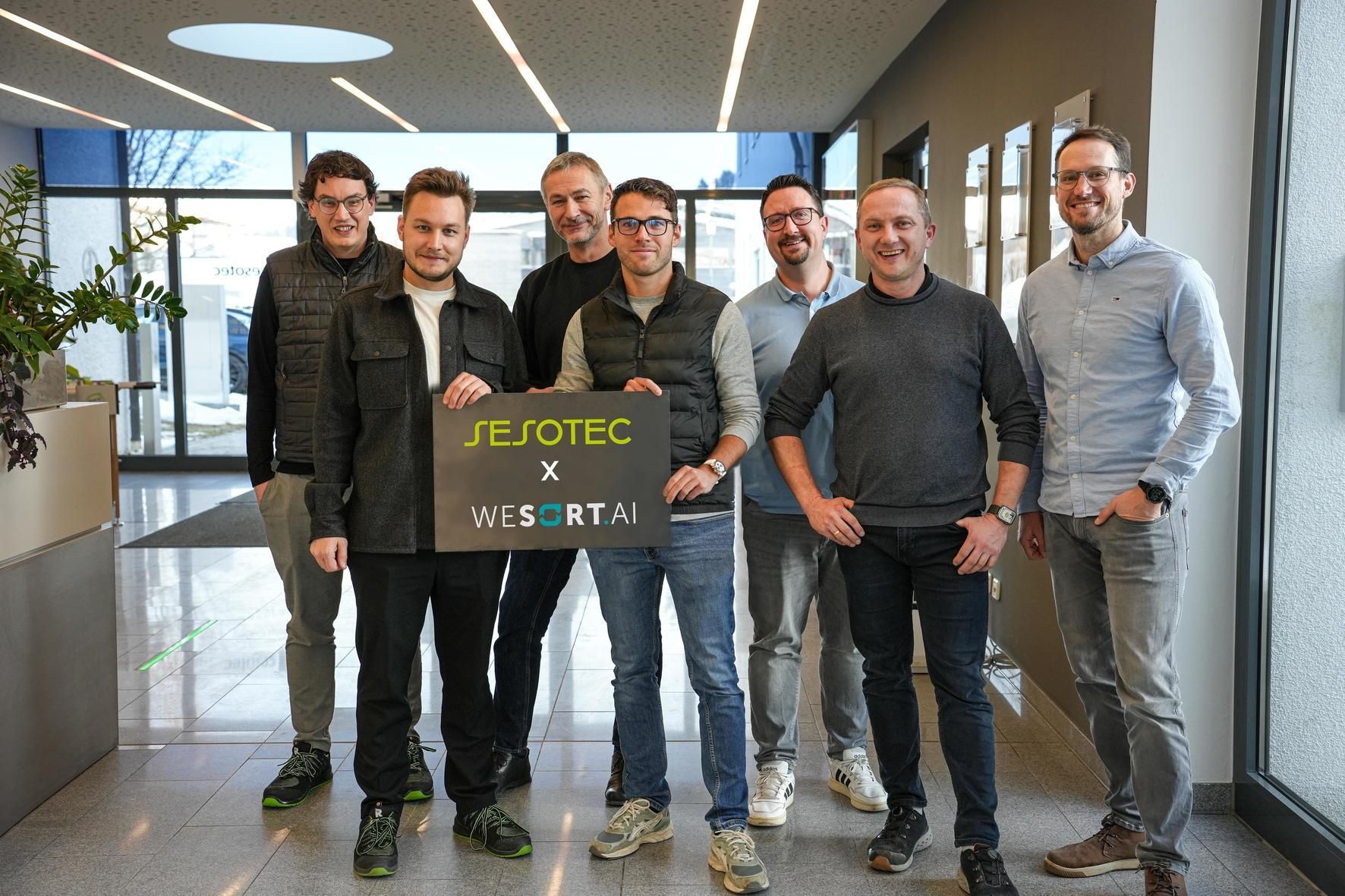 Titelbild: Perfektes Match: Die Teams von Sesotec und WeSort.AI: (v.li.) Johannes Laier, Nathanael Laier (beide WeSort.AI-Gründer), Hans Eder (Sesotec Head of Development & Innovation), Andreas Hanus (Sesotec Head of Development AI), Daniel Hayn (WeSort.AI Head of Sales), Tobias Eder (Sesotec Head of Technology & Plastics), Jens Astfalk (Sesotec Head of Sales & Key Account Management Sorting Recycling) (Foto: Sesotec GmbH)