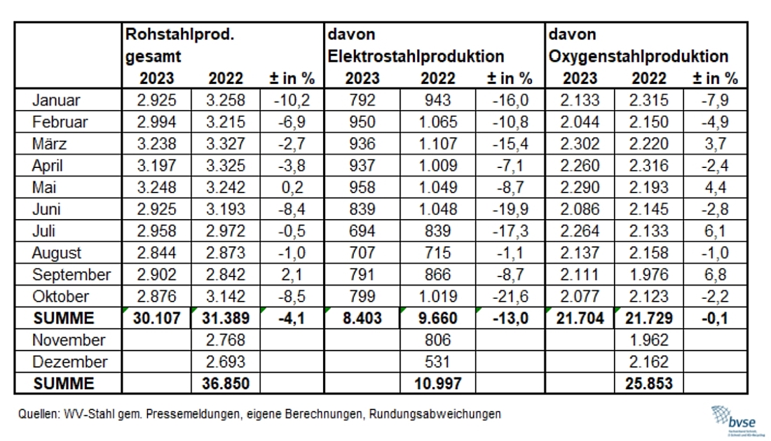 Der  Oktober  bescherte den Herstellern einen Rückgang von rund 9 Prozent und beschleunigte damit den Rückgang deutlich.  Besonders  die  stromintensiven  Elektrostahlwerke  stehen   vor   einer   schwierigen   Ausgangslage.
