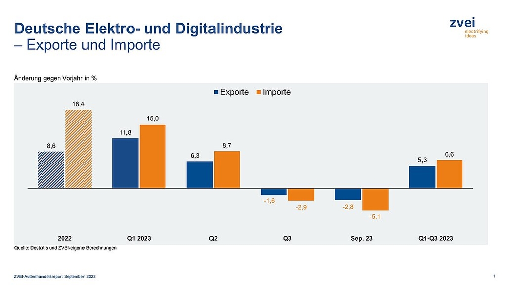 Die Einfuhren elektrotechnischer und elektronischer Produkte nach Deutschland gingen im September stärker zurück als die Exporte. Hier gab es ein Minus von 5,1 Prozent gegenüber Vorjahr auf 21,7 Milliarden Euro. Für die ersten drei Quartale 2023 steht aber auch bei den Importen weiter ein Zuwachs zu Buche – um 6,6 Prozent auf insgesamt 201,4 Milliarden Euro.