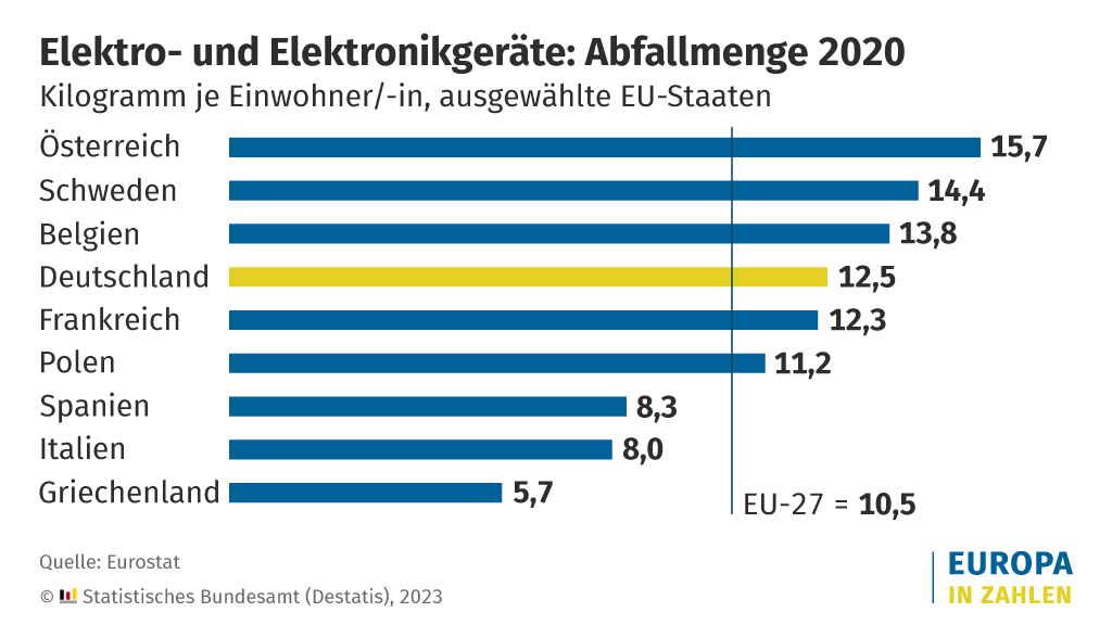 Pro Kopf verursachte jede/r EU-Bürger/-in im Jahr 2020 durchschnittlich rund 10,5 Kilogramm Elektroschrott. Deutschland lag mit 12,5 Kilogramm noch über dem EU-Durchschnitt. Die EU-weit höchsten Abfallmengen pro Kopf verzeichneten Österreich und Finnland (je 15,7 Kilogramm) und Schweden (14,4 Kilogramm). 81,6 % des gesammelten Elektroschrotts wurde 2020 in der EU recycelt. In Deutschland waren es 85,1 %.