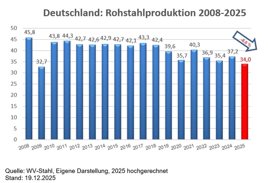 Auf das gesamte Jahr 2025 hochrechnet, liegt die gesamte deutsche Rohstahlproduktion voraussichtlich bei lediglich 34 Mio. Tonnen und damit um ca. -8,6 Prozent unter dem niedrigen Vorjahresniveau von 37,2 Mio. Tonnen. Damit wird nicht nur das vierte Mal in Folge die 40-Mio.-Tonnen-Grenze nicht erreicht, das wäre sogar die niedrigs-te Produktion seit dem Finanzkrisenjahr 2009 mit 32,7 Mio. Tonnen.