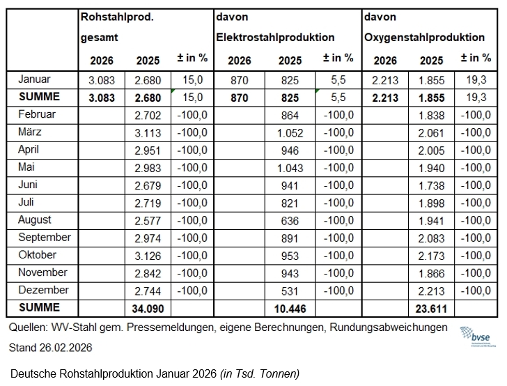 Im ersten Monat des neuen Jahres stieg die Stahlproduktion deutlich an. Rund 3,1 Mio. Tonnen sorgten für einen Anstieg von 15 Prozent gegenüber dem Vorjahresmonat.