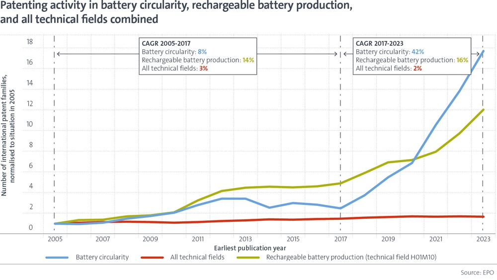 Die Patentierungstätigkeit auf dem Gebiet der zirkulären Batteriewirtschaft erlebt seit 2017 einen massiven Anstieg – dem Jahr, in dem weltweit erstmals mehr als 1 Million Elektrofahrzeuge verkauft wurden. Seit damals erhöhte sich die Zahl der zugehörigen IPFs im Mittel um jährlich 42 %, während die Produktion wiederaufladbarer Batterien um 16 % zulegte und über alle Technologiebereiche hinweg ein Wachstum von nur 2 % zu verzeichnen war.